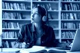 Pensive young woman student learn foreign language at online interactive video course sit by notebook screen in headset look aside think on text translation ponder on exercise before write to copybook