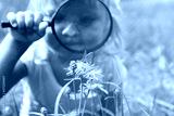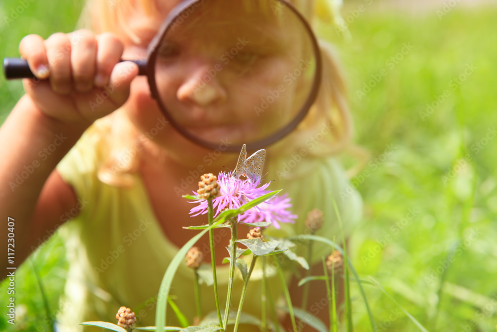 Little girl examining batterfies on flower using magnifying glass
