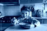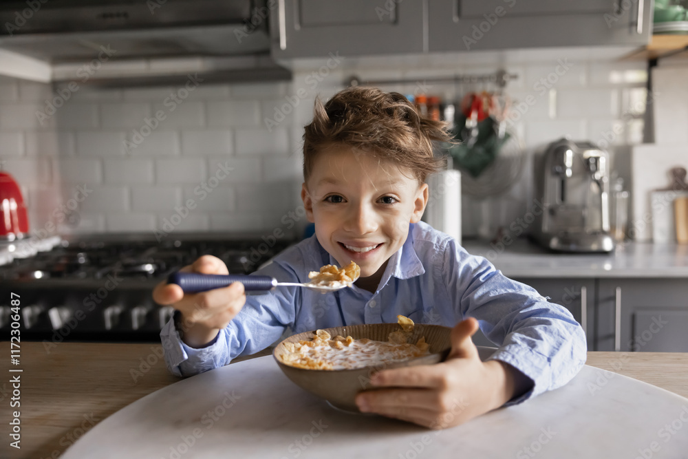 Cheerful kid having breakfast in home kitchen, looking at camera, smiling, posing for portrait. Funny cute early school aged boy eating corn flakes with milk, enjoying tasty sweet meal