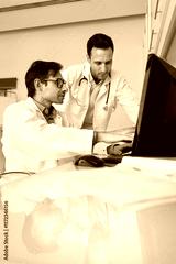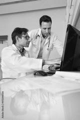 Team of two male doctors reviewing clinical medical case at computer together, looking and pointing at monitor at workplace table, talking, discussing examination report, diagnosis. Vertical shot