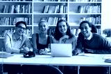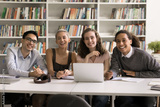 Diverse friends. Group portrait four happy smart young people teenage students of different ethnicities sit by desk at library look at camera distracted from teamwork on academic research books laptop