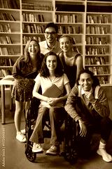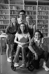 Inclusion and diversity. Vertical shot happy diverse polyethnic students group posing for portrait. Smiling teen female on wheelchair look at camera together with friendly supportive mates at library