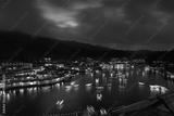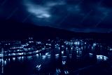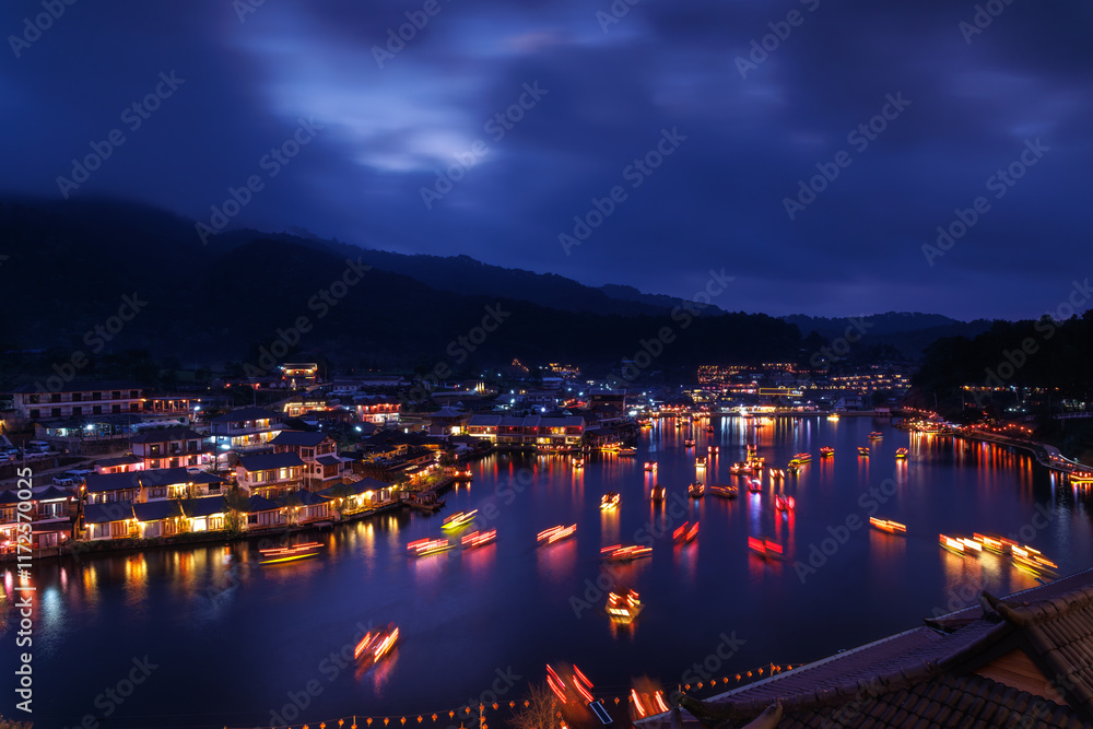 Ban Rak Thai Village at night scene, over colorful lighting and beautiful decorative lamps, motion blur chinese boats in the lake, long exposure shot