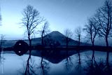 Fuji Mountain reflection water in front in Winter at morning sunrise scene view, location and landmark of Fumotoppara Campground, japan