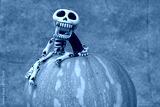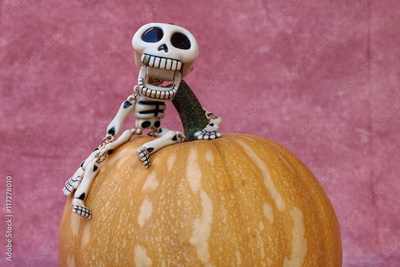 SPOTLIGHT A FUNNY SKELETON RISEN UP A PUMPKIN WITH PURPLE BACKGROUND HORIZONTAL