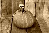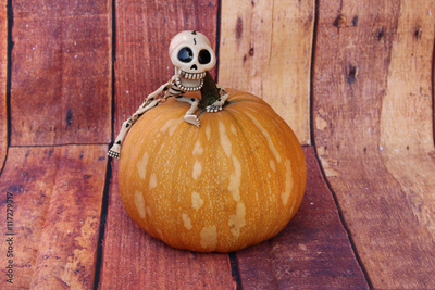 SKELETON FUNNY LAUGHING RISEN UP A PUMPKIN WITH WOODEN BOARDS BACKGROUND