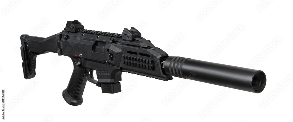 A modern black PCC (Pistol Caliber Carbine) with a suppressor, tactical rails, and adjustable stock, isolated on a white background, ideal for military.