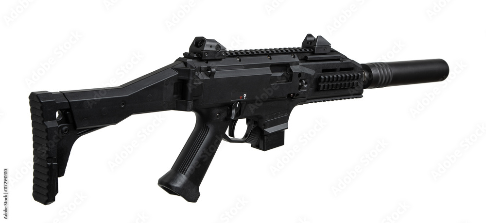 A modern black PCC (Pistol Caliber Carbine) with a suppressor, tactical rails, and adjustable stock, isolated on a white background, ideal for military.