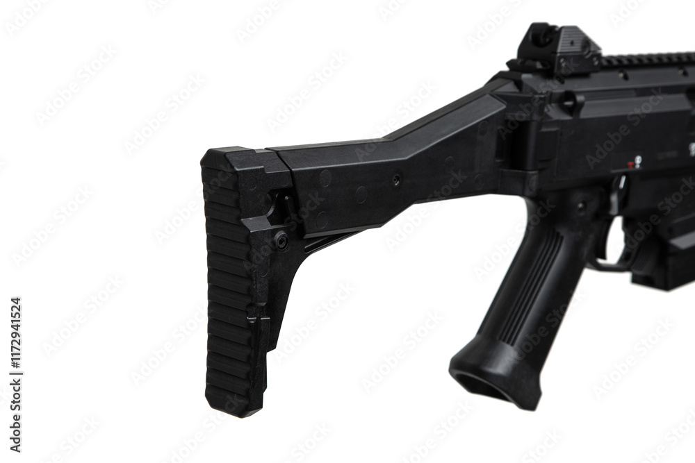 A modern black PCC (Pistol Caliber Carbine) with a suppressor, tactical rails, and adjustable stock, isolated on a white background, ideal for military.