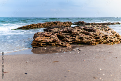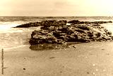 Rocky beach with waves crashing against the shore, clear blue sky.