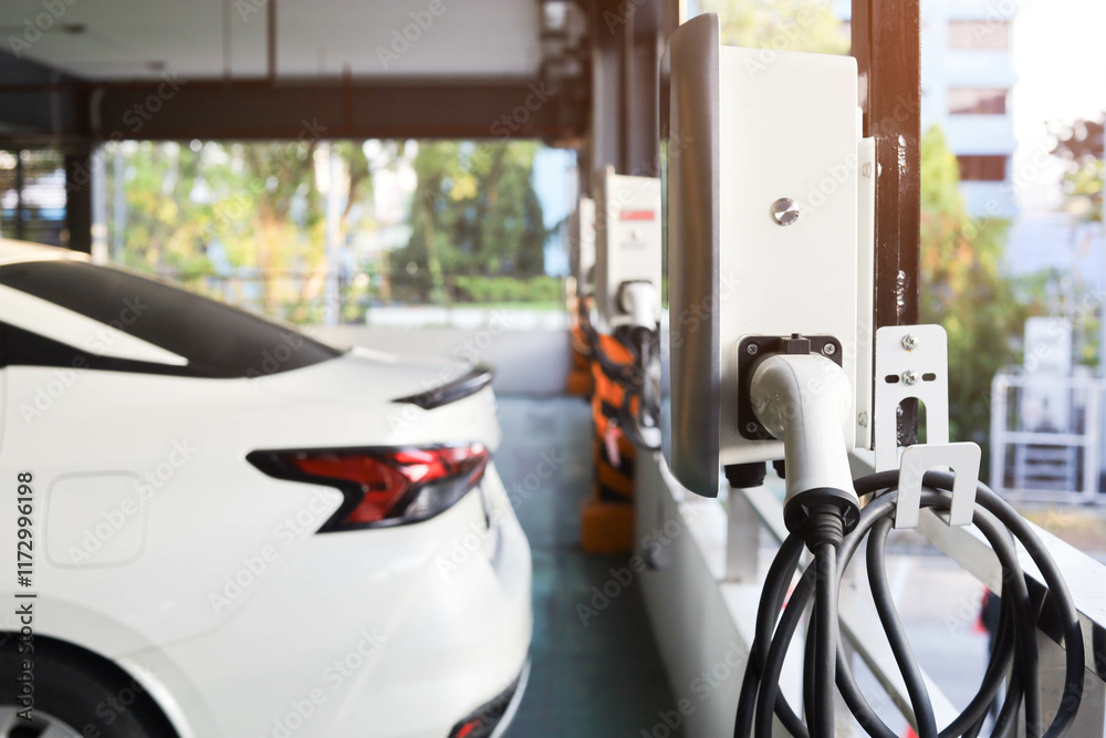 Modern electric vehicle charging station in an outdoor parking lot in the city