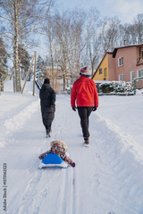 Couple walking for a stroll in colder winter time with small child in sled for a nice walk and spending time together
