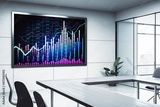 Modern conference room interior with large digital financial chart screen, bright daylight, and empty workspace. 3D Rendering
