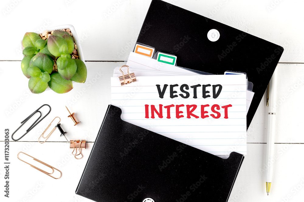 Vested interest concept displayed on note cards in a black holder with a succulent plant, clips, and a pen on a white wooden desk