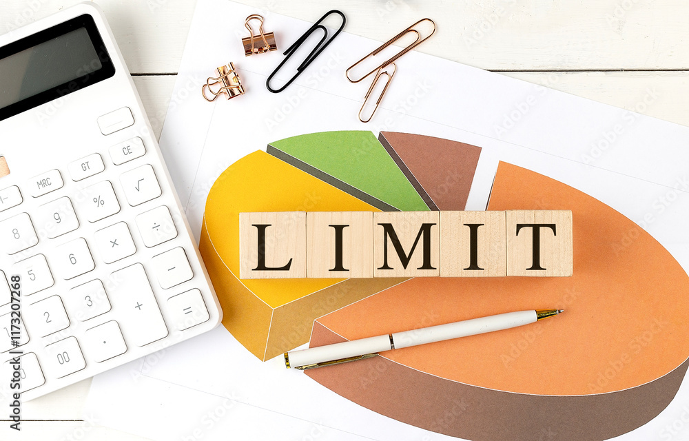 Limit concept represented with wooden blocks on a pie chart, accompanied by a calculator, pen, and paper clips