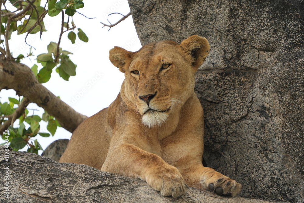 portrait of a female lion lioness laying on a stone in the serengeti national park tanzania