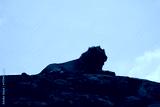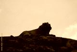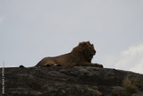 male lion laying on top of a rock in the middle of the serengeti national park with his mane blowing in the wind