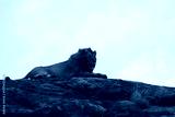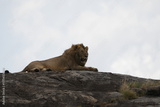 male lion laying on top of a rock in the middle of the serengeti national park with his mane blowing in the wind