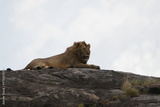male lion laying on top of a rock in the middle of the serengeti national park with his mane blowing in the wind