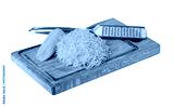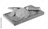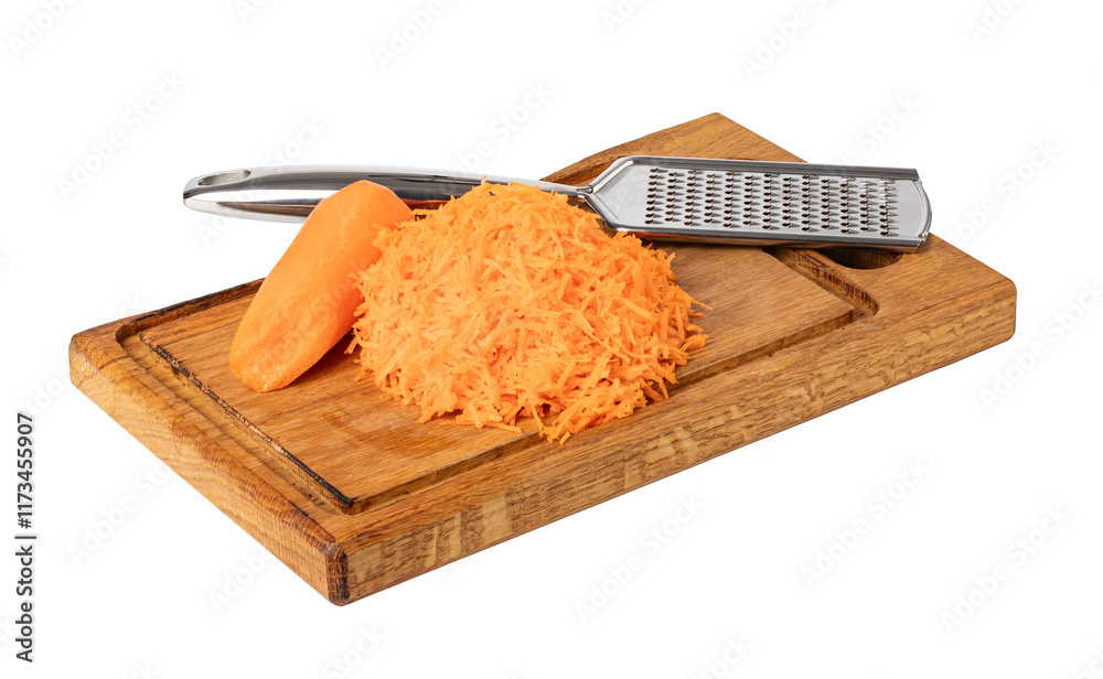 Grated carrots on wooden cutting board with grater and carrot piece isolated on transparent background
