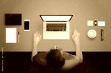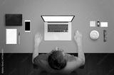 Top view of office desk. Designer working on a laptop with isolated display for mockup.
