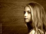 Portrait of a teen girl. Long blond hair, a pretty face. Background dark wooden board