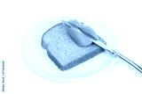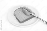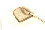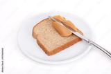 Peanut Butter Spread on Wheat Bread – A slice of wheat bread with knife spreading peanut butter. One a white plate, on a white background.