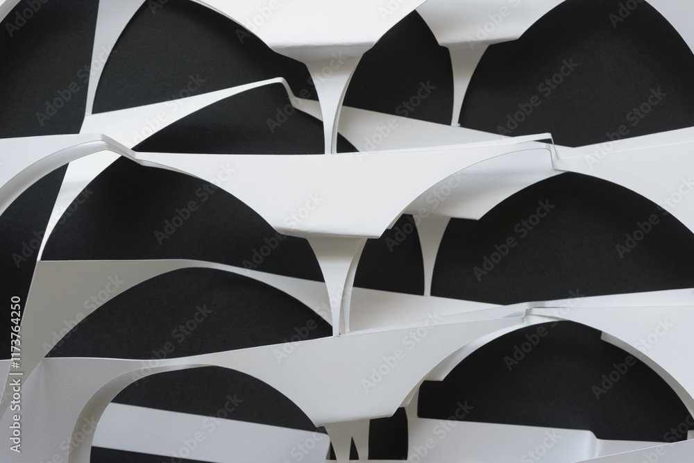crumpled white paper stencils with semi circle cutouts arranged on blank black paper