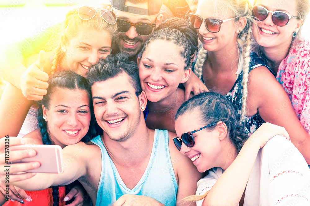 Cheerful group of friends having fun taking selfie at sunset on the beach - Joyful teenagers freezing a moment of celebration during summer festival outdoor - Vintage filter look with sun halo filter