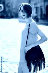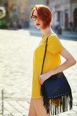 Outdoor portrait of young beautiful fashionable lady walking on street. Model wearing stylish summer clothes. Girl looking at camera. Female fashion concept. City lifestyle. Sunny day. Waist up