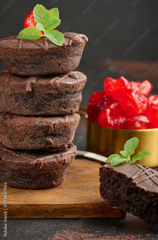 Chocolate brownies stacked, with the top adorned by a juicy red cherry and mint leaves