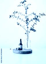 Glass brown bottle with a pipette on a wooden podium and a branch of eucalyptus.