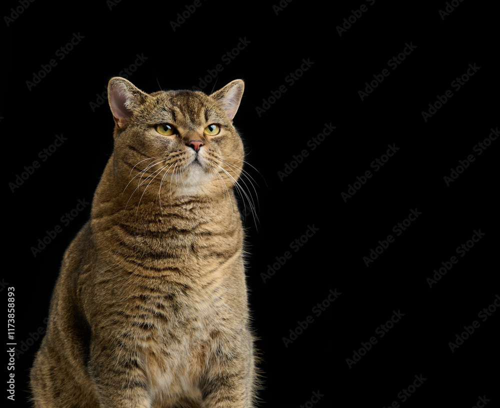 Portrait of an adult serious gray cat, purebred straight-eared Scottish