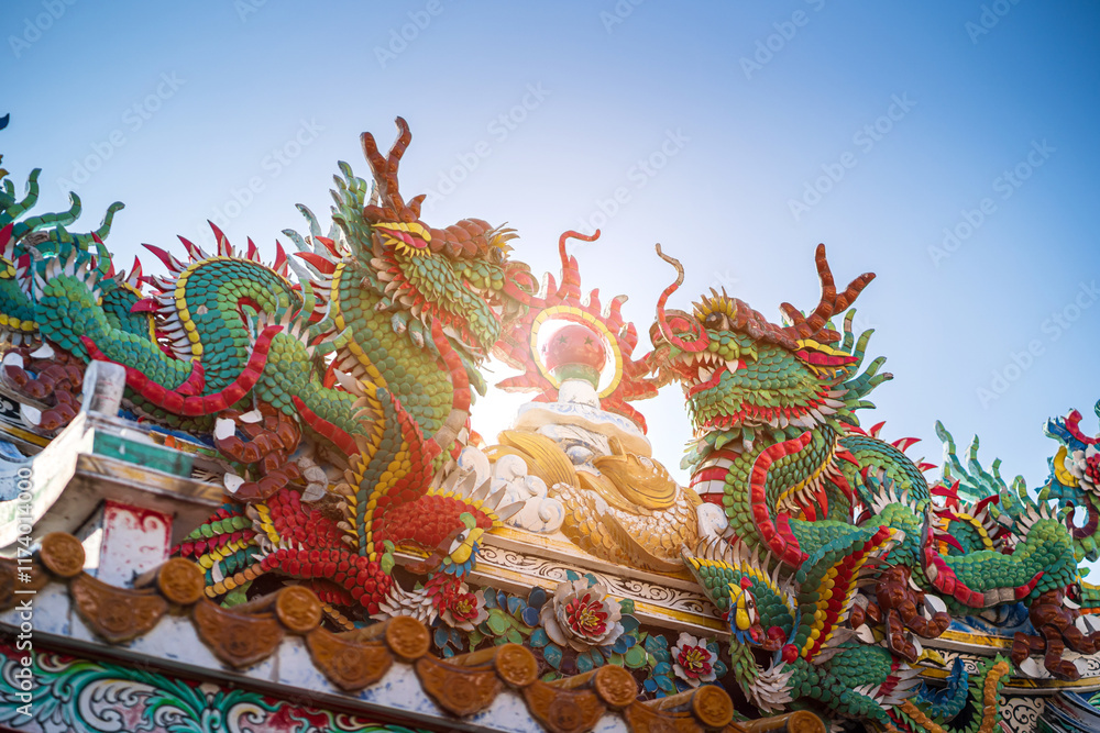 Beautiful Elegant double golden dragon statue on the roof of on a temple for Chinese New Year Festival at Chinese shrine with blue sky.