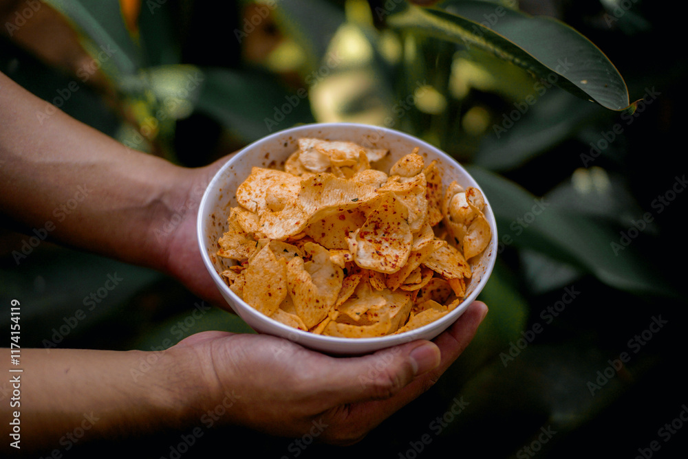 hand holding a bowl of spicy snacks
