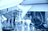 A scientist in a lab wearing gloves holds a flask with orange liquid during an experiment in a modern laboratory setting