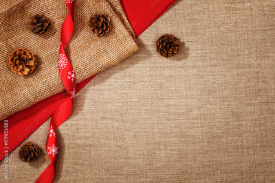 Christmas decoration background over linen background. Horizontal photo taken from above, top view with copy space for text and other web or print design elements.