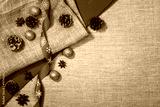 Christmas decoration background over linen background. Horizontal photo taken from above, top view with copy space for text and other web or print design elements.