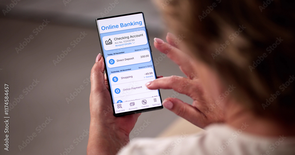 Woman Using Mobile Phone Checking Bank Statement