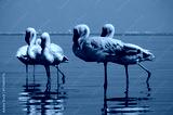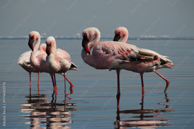 Wild African birds. Flock of pink flamingos in a blue water reflection on a summer day