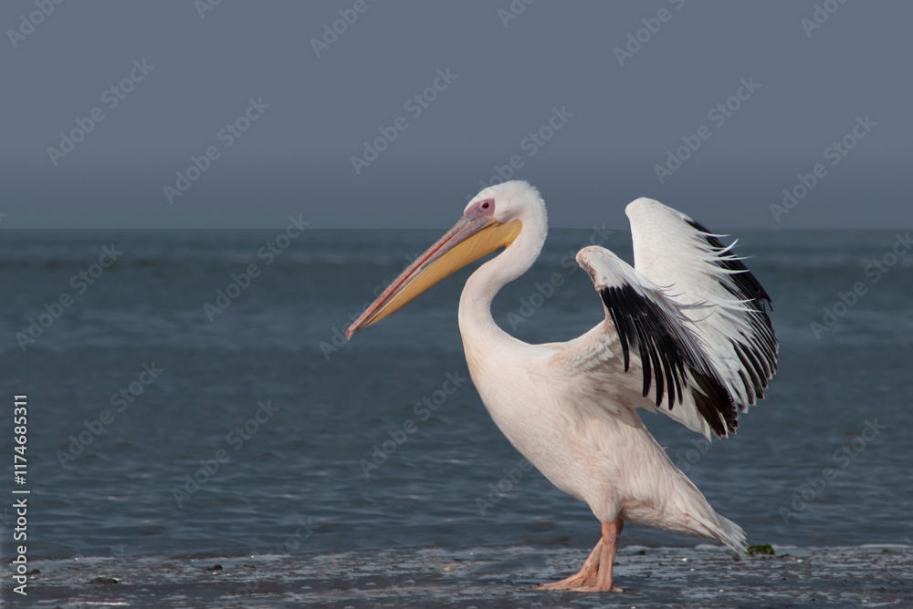 African wild birds. A lone Great pelican on a blue lagoon on a sunny day