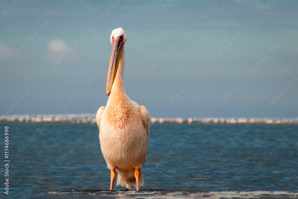 African wild birds. A lone Great pelican on a blue lagoon on a sunny day