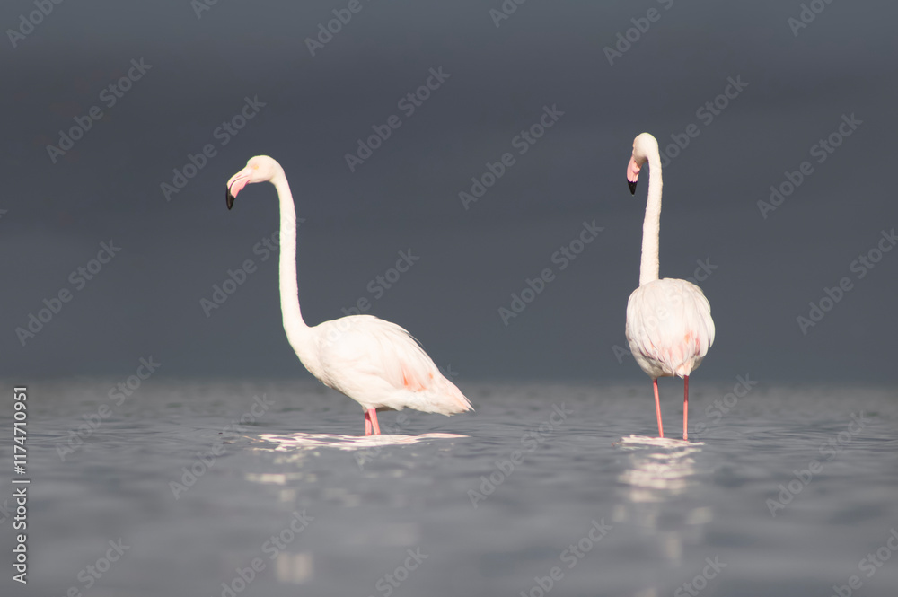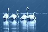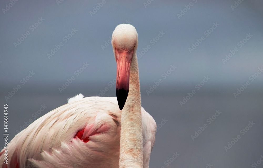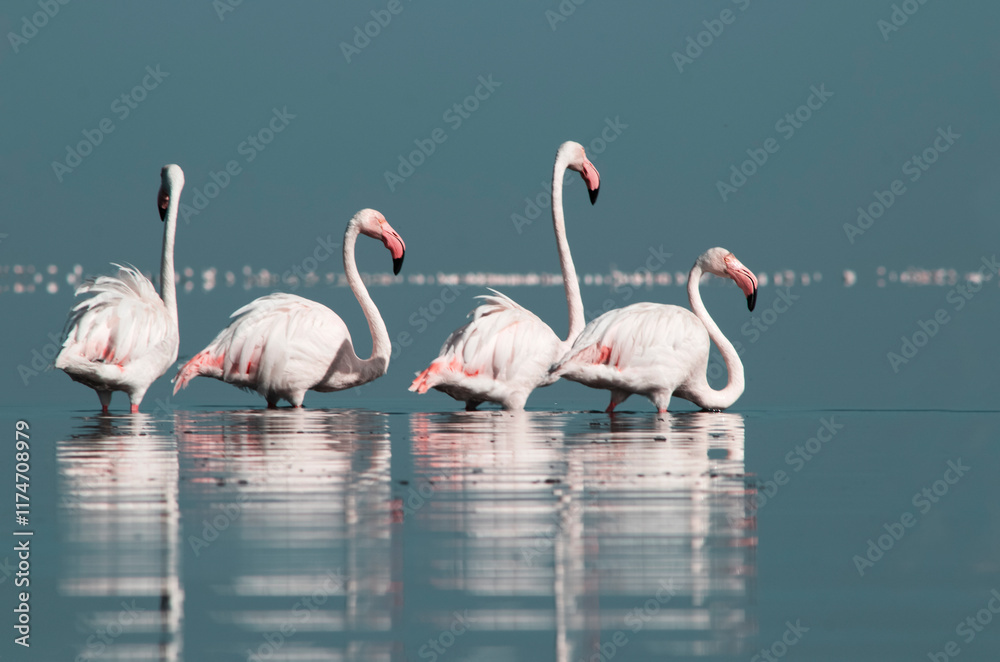 African wild birds. A flock of great flamingos on the blue lagoon against the bright sky