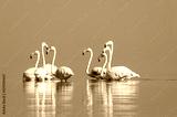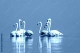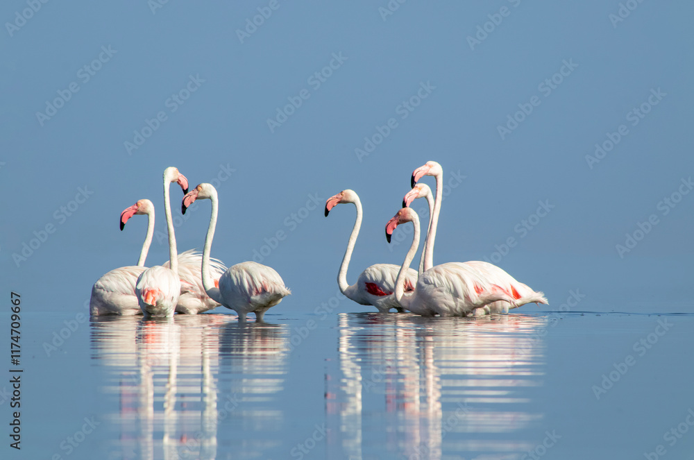 African wild birds. A flock of great flamingos on the blue lagoon against the bright sky
