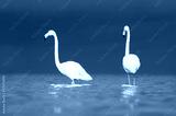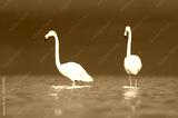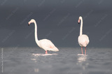Wild african birds. Two Great african flamingos walking around the blue lagoon against bright sky