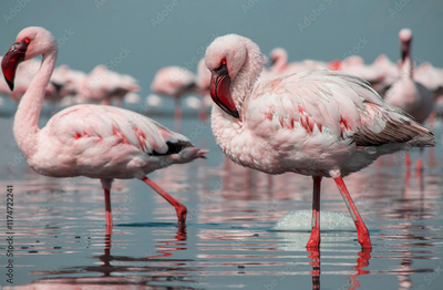 Wild African birds. Flock of pink flamingos in a blue water reflection on a summer day