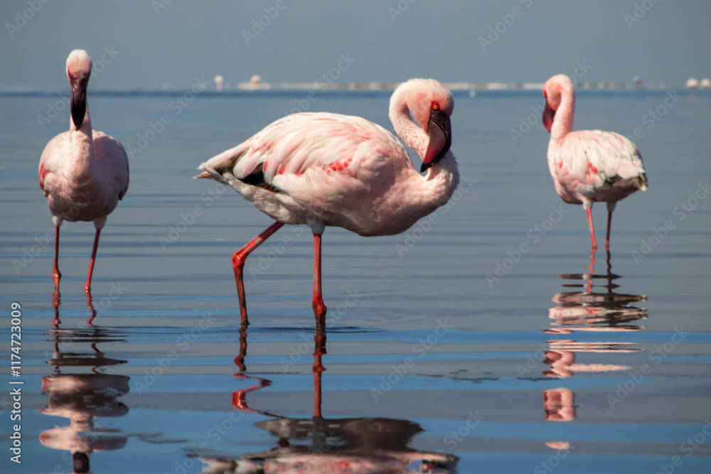 Wild African birds. Flock of pink flamingos in a blue water reflection on a summer day