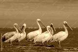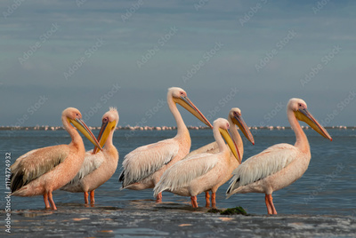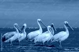 African wild birds. Great pelicans on the blue lagoon on a summer morning