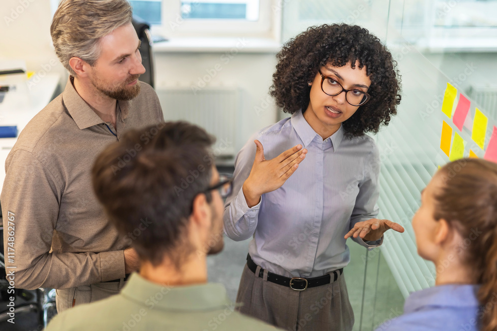 Creative group or business people planning innovation with sticky notes on glass wall. Top view