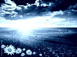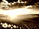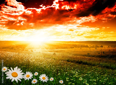 summer landscape field of green grass and sunset